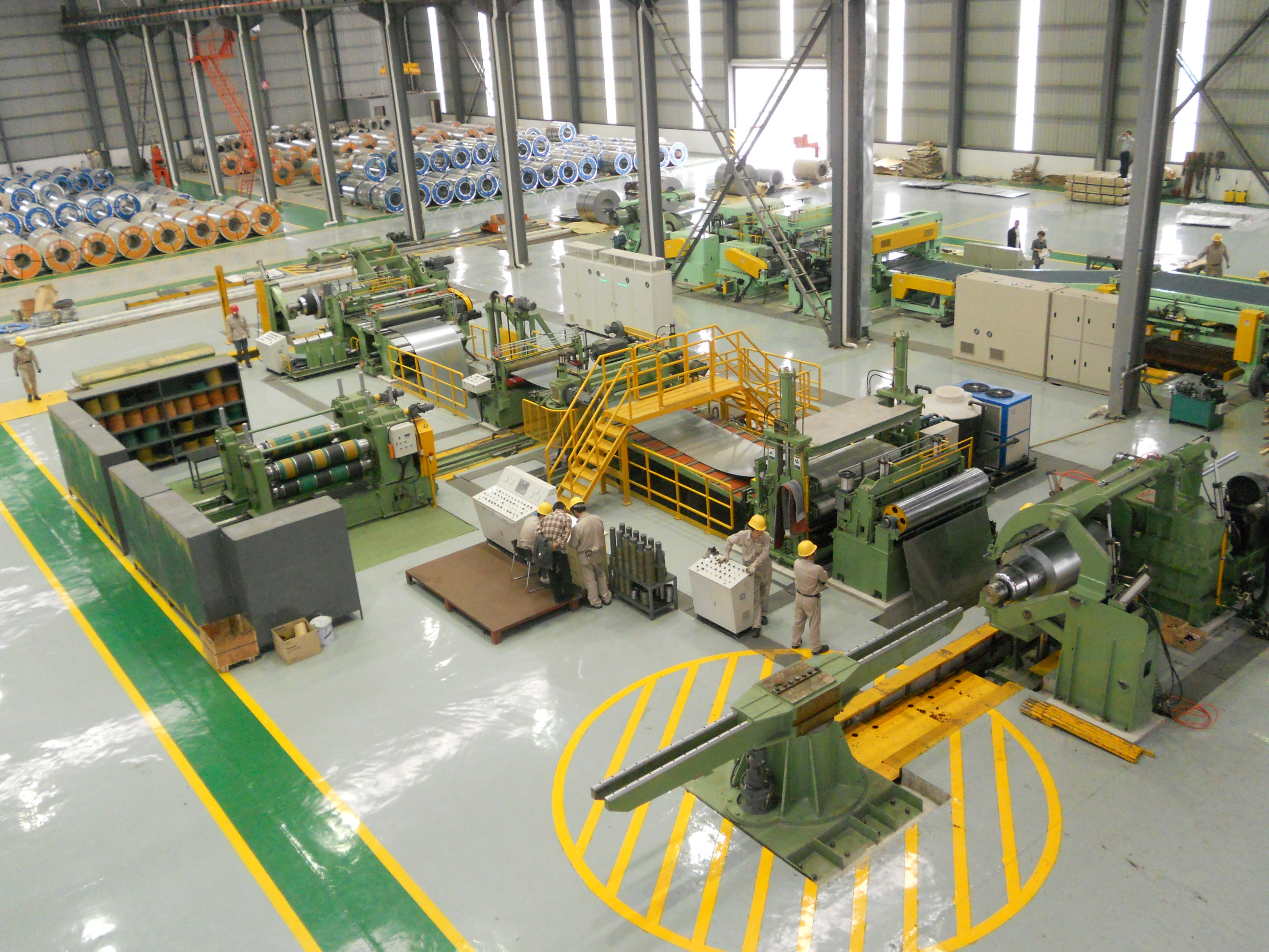 1)工藝流程及特點(diǎn)概述 鋼卷由行車(chē)從鋼卷庫(kù)吊到鋼卷備料裝置上,然后由鋼卷小車(chē)送到開(kāi)卷機(jī)卷筒上,卷筒漲開(kāi)使鋼卷固定在卷筒上,拆掉捆帶,借助開(kāi)卷裝置,將帶頭引入夾送裝置中,輸送到粗矯,通過(guò)側(cè)導(dǎo)對(duì)中,分條剪切(剪邊),活套,張力卷取,下料。 2)適應(yīng)材料:冷軋、電鍍鋅、熱鍍鋅、鍍鋁鋅、電工鋼、涂鍍板、不銹鋼